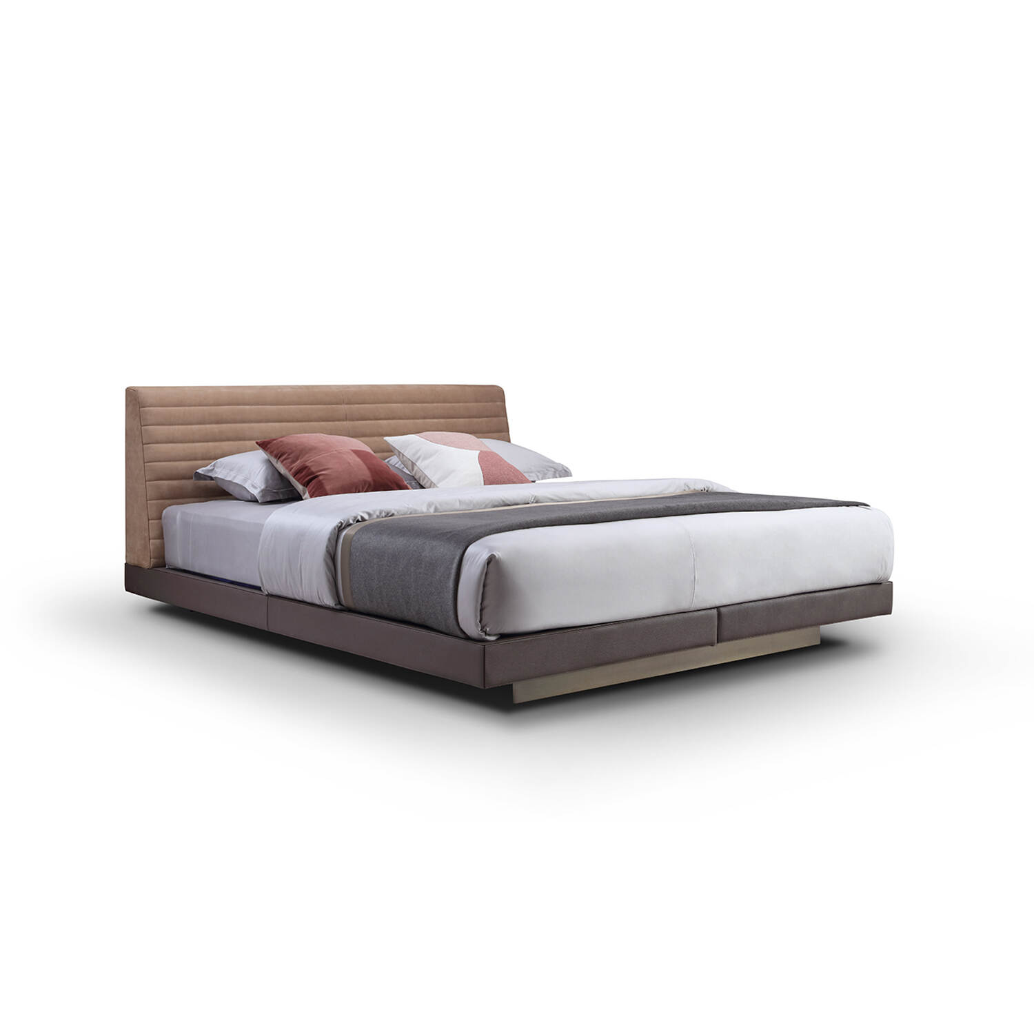 The bed’s horizontally striped headboard and deep brown upholstered frame provide contrast and dimension, creating a visually layered and sophisticated appearance that enhances any bedroom.