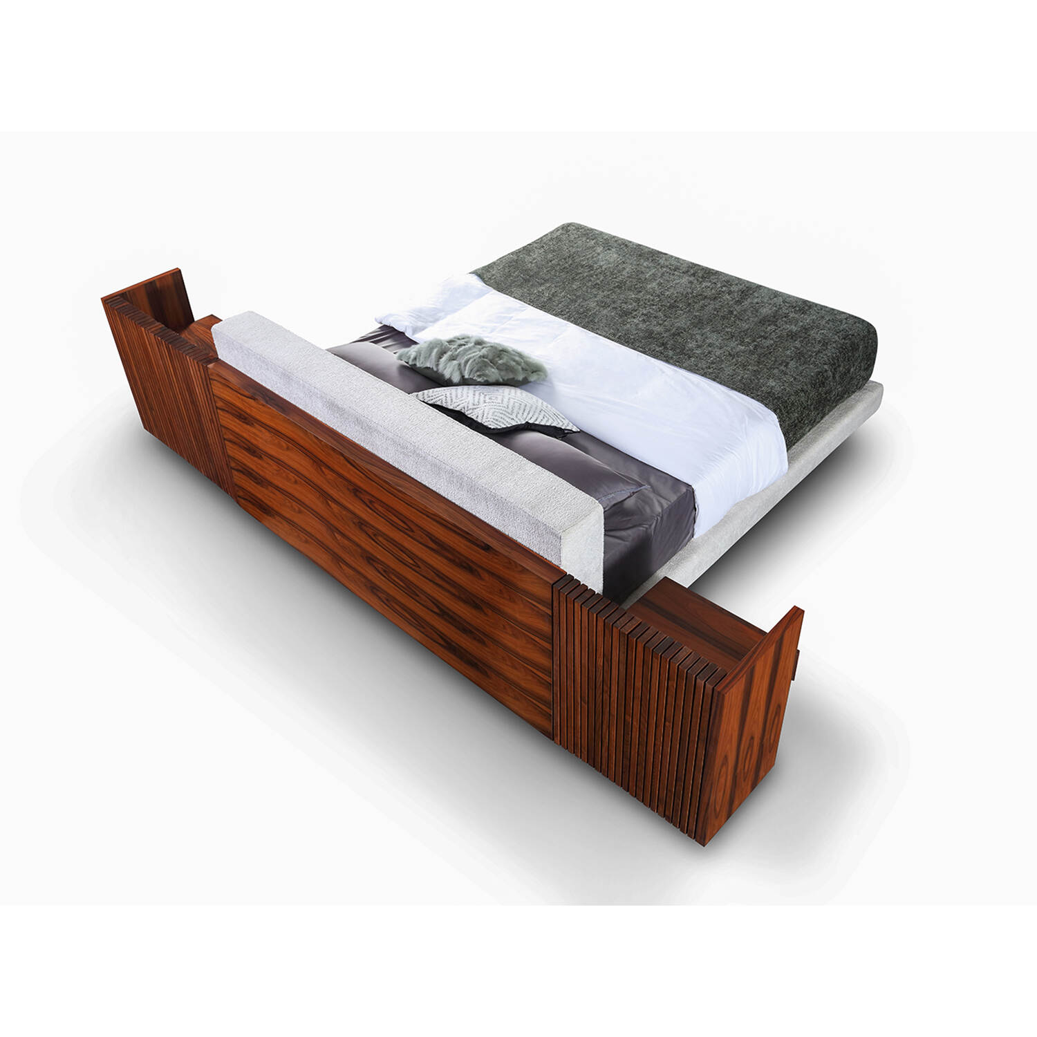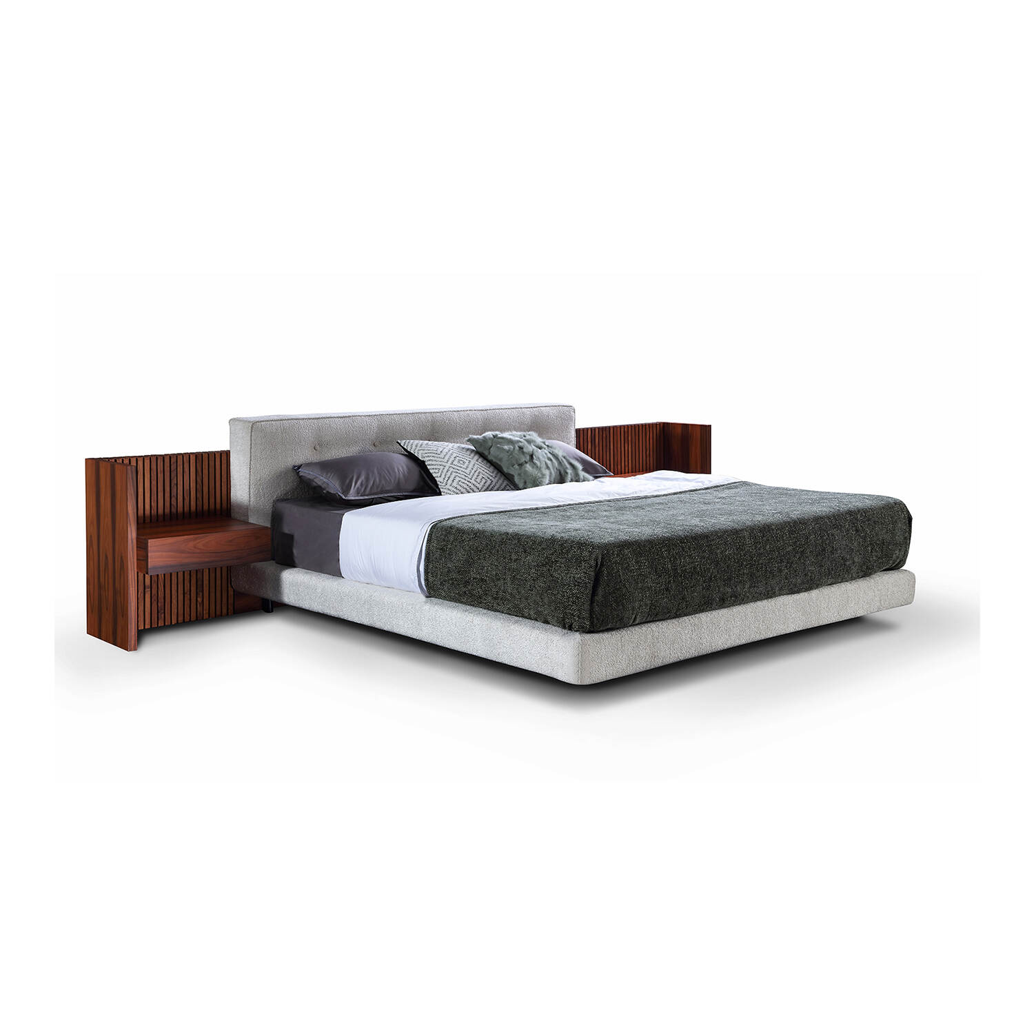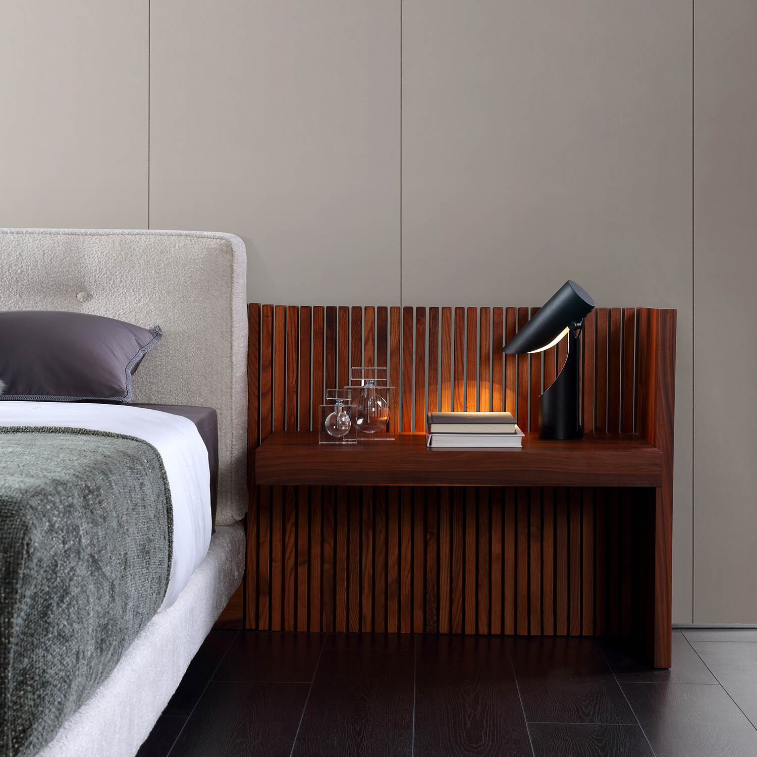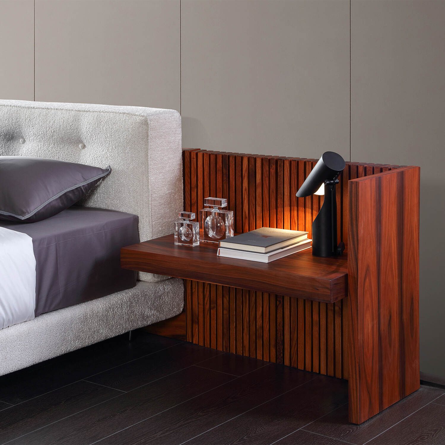 A built-in wooden nightstand with a vertical stripe texture offers added convenience and storage. It supports practical use while contributing to the overall sophistication and symmetry of the bed’s design.
