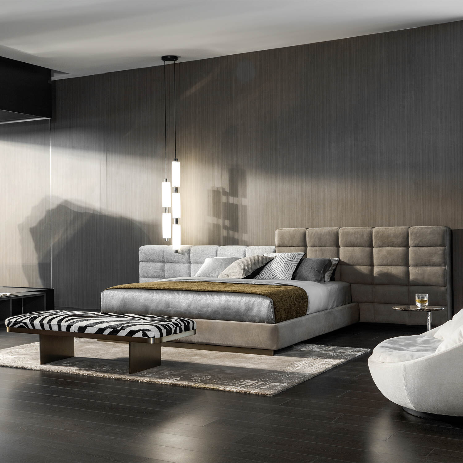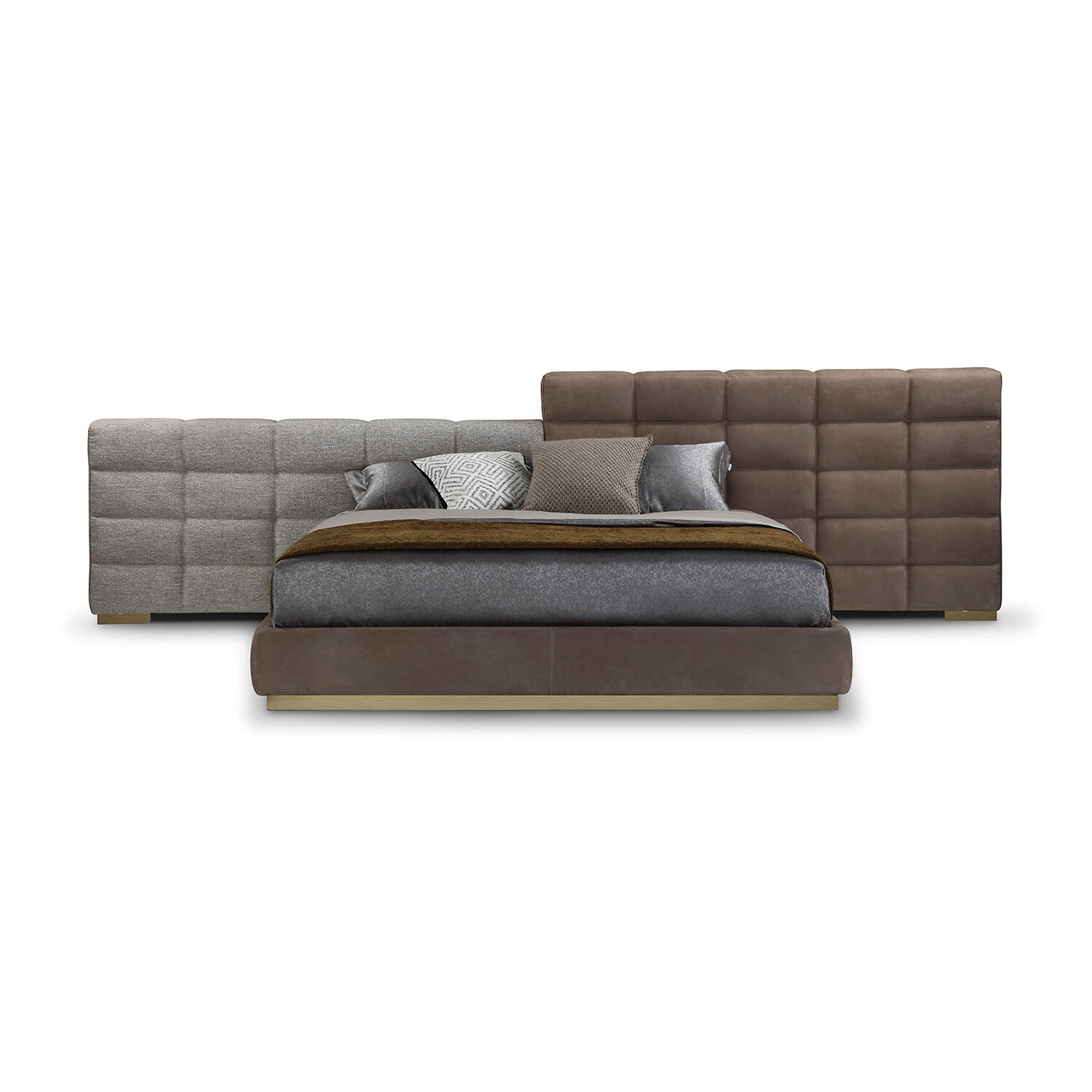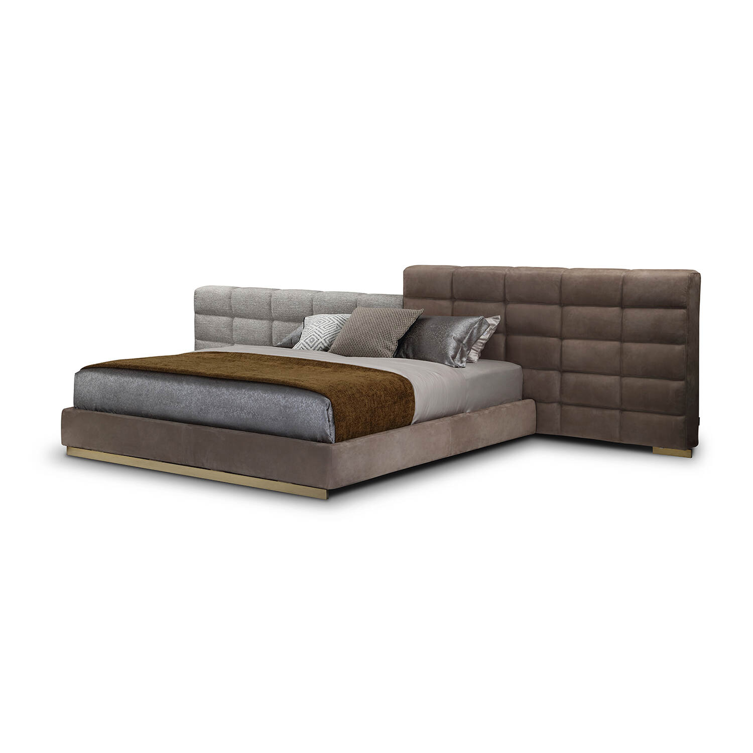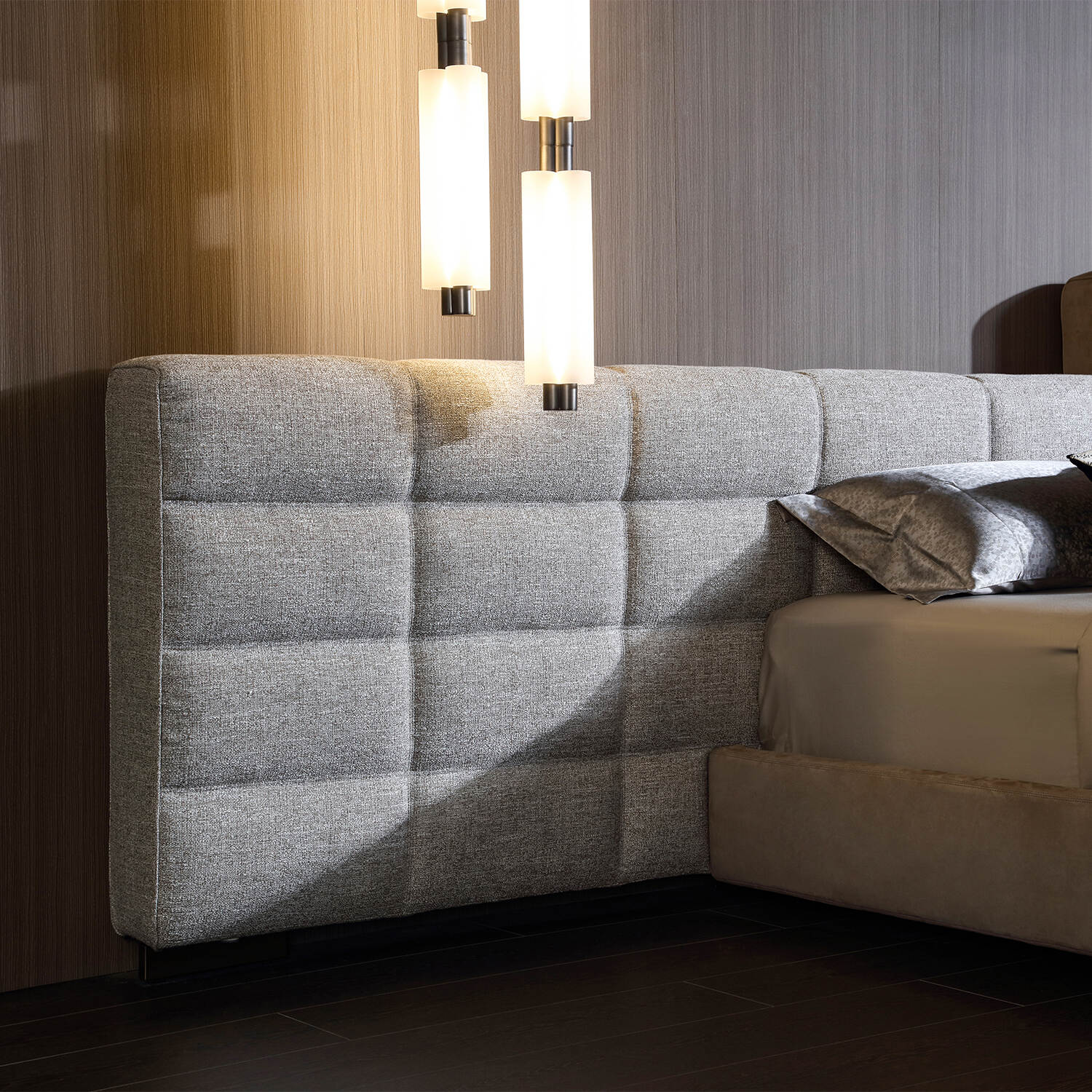 The wide headboard features a symmetrical square grid pattern wrapped in soft velvet, adding texture and elegance to the room while providing a plush and supportive surface to lean on.