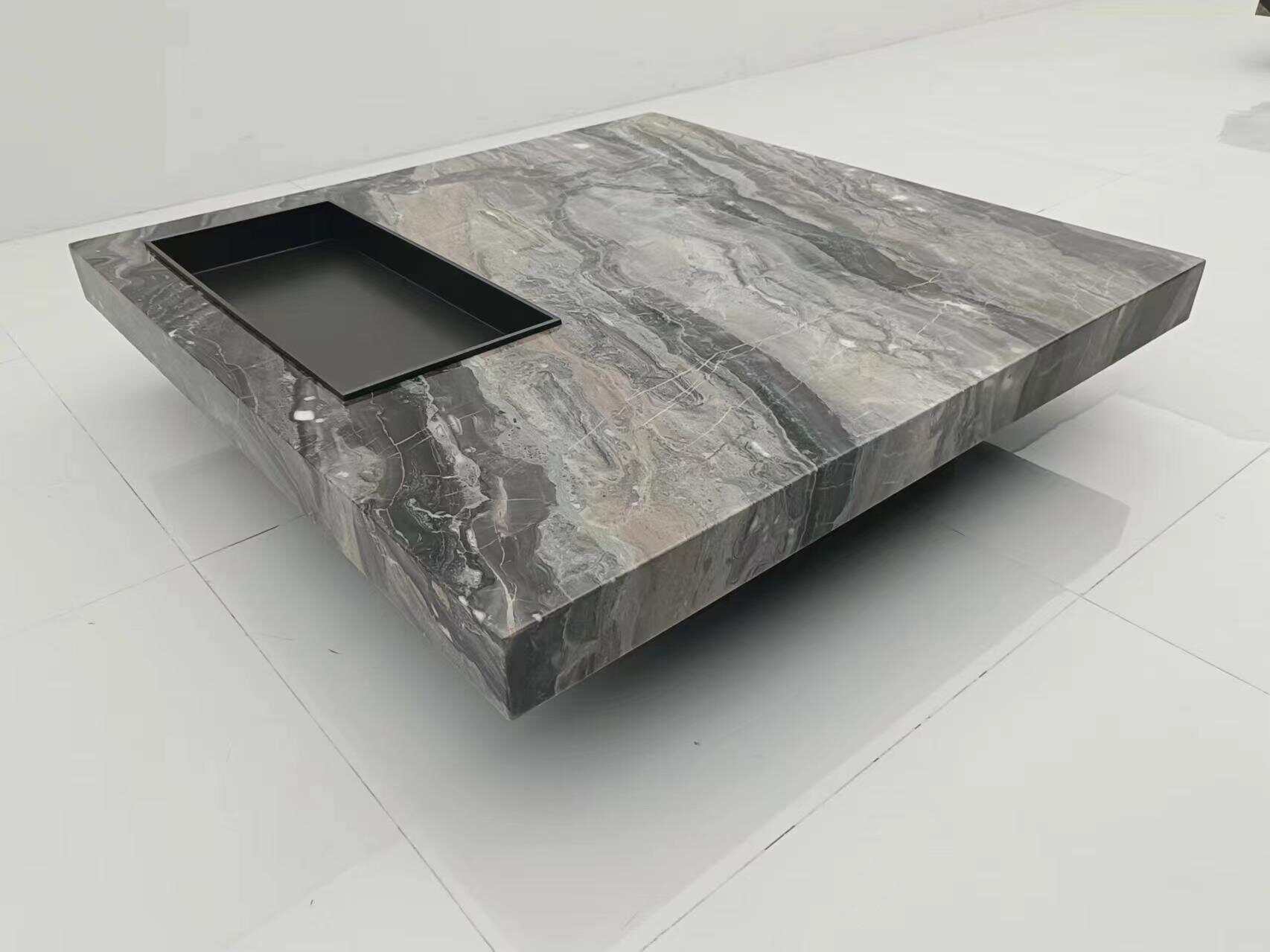 The BRC18010-3/BRC18010-7 is a square marble coffee table with a minimalist suspended design and a central sunken area for practical use. With hidden legs and stainless steel support, this table combines visual lightness with structural strength. Its grey marble finish and clean lines suit modern interiors, offering both form and function for residential and commercial living spaces.