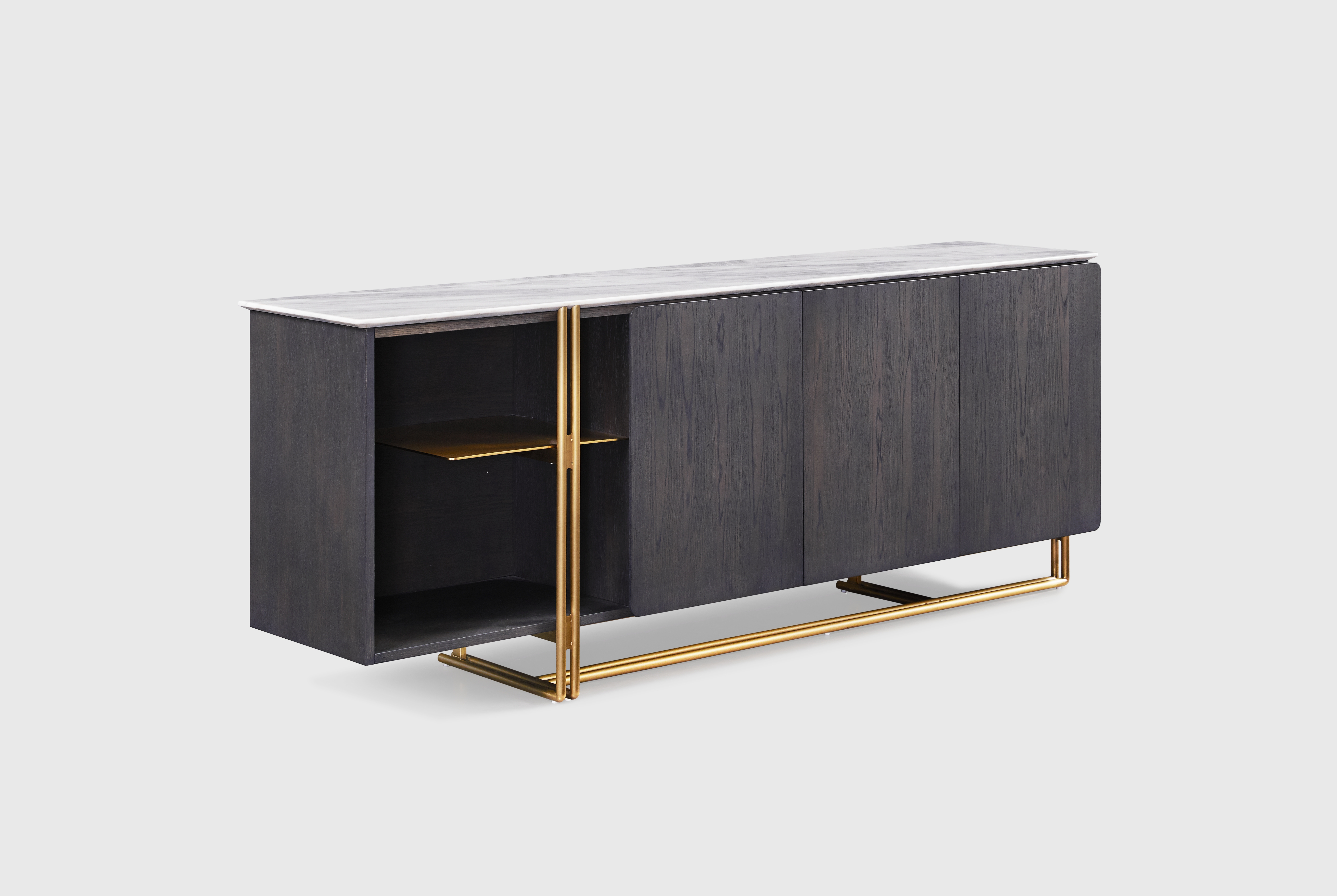 The BRG21015-2 buffet cabinet by BAM FURNITURE brings modern elegance and functionality to dining rooms, kitchens, or upscale hospitality spaces. Featuring a marble top, natural veneer finish, and a striking brass geometric base, this piece offers ample storage and display space. Its clean lines, open shelving, and concealed cabinets create a sophisticated yet practical design that elevates contemporary interiors.