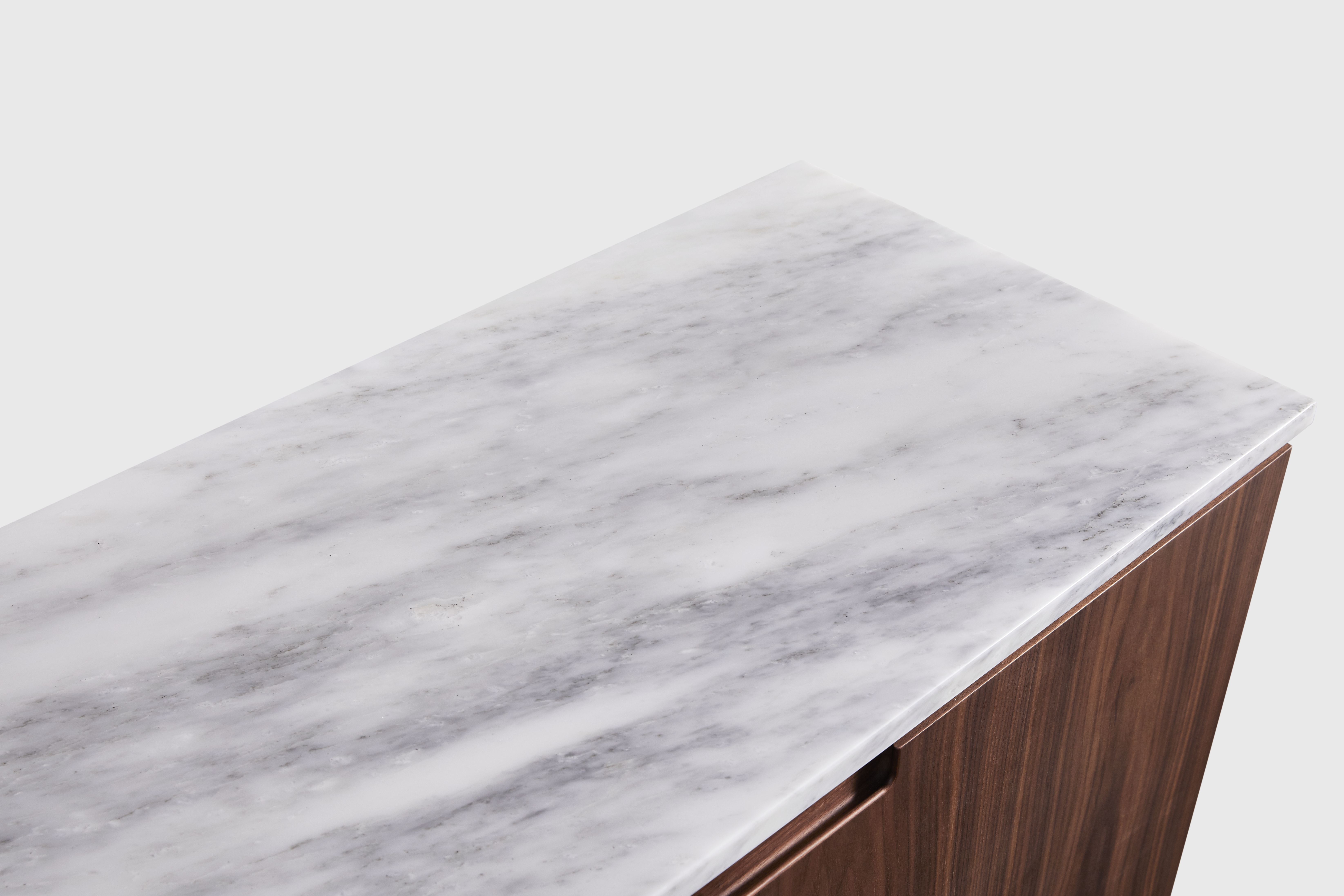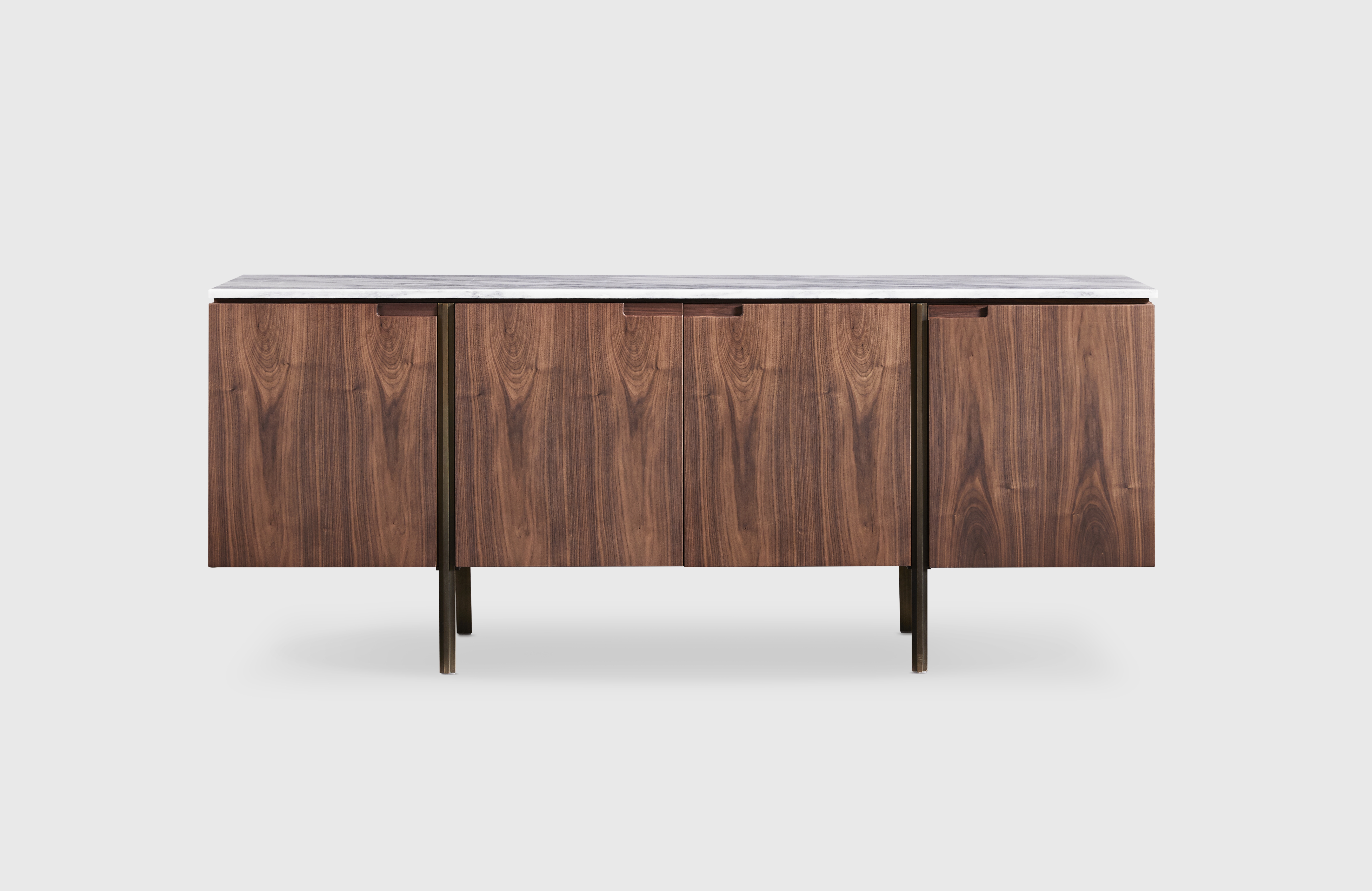 The BRG21018 buffet cabinet offers a refined combination of natural textures and modern elegance. Designed with a light-colored marble top, walnut veneer body, and brass-finished steel legs, this piece suits both contemporary and retro-inspired interiors. Its minimalist silhouette and spacious concealed storage make it ideal for enhancing functionality without compromising on aesthetic appeal.