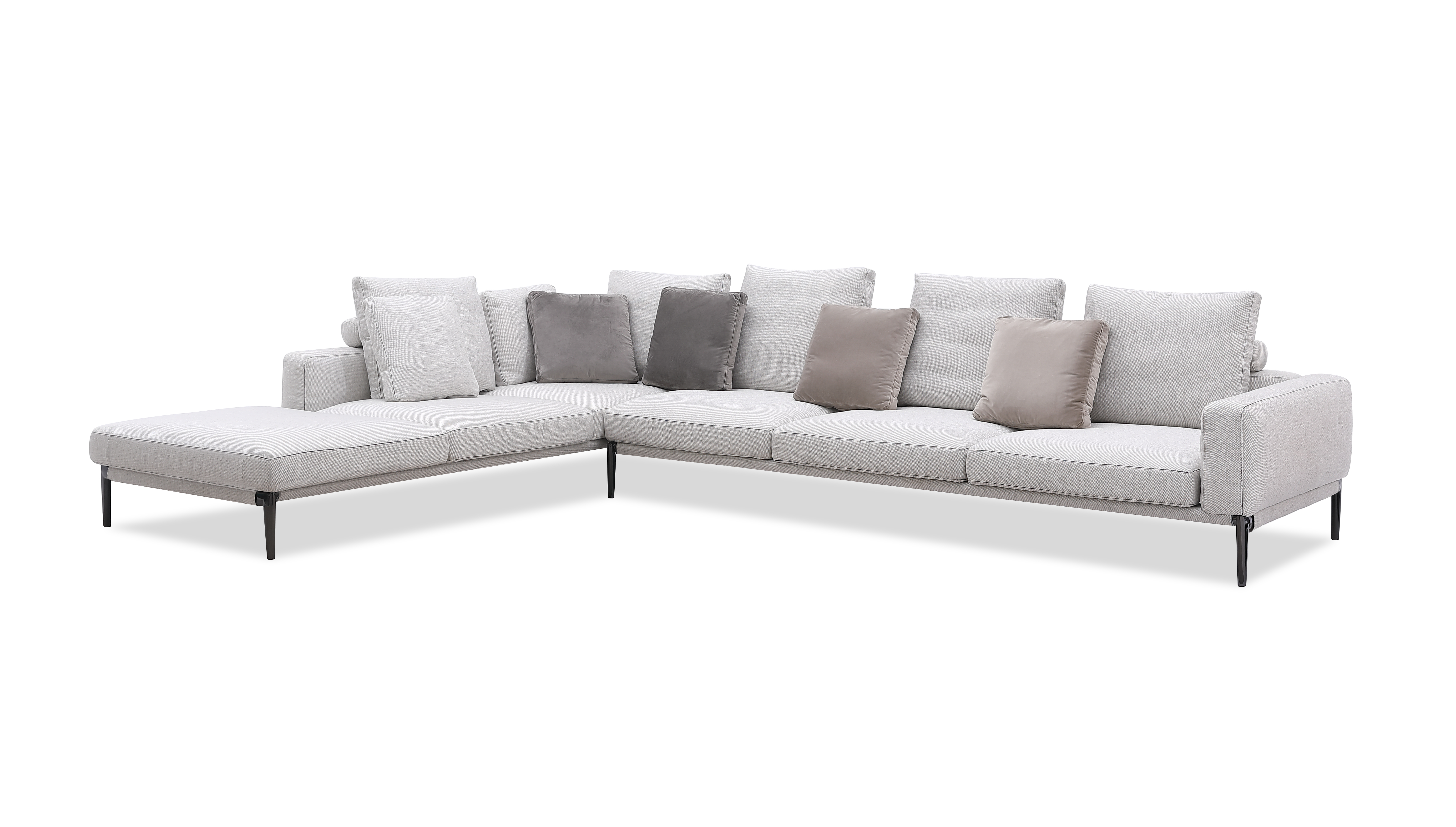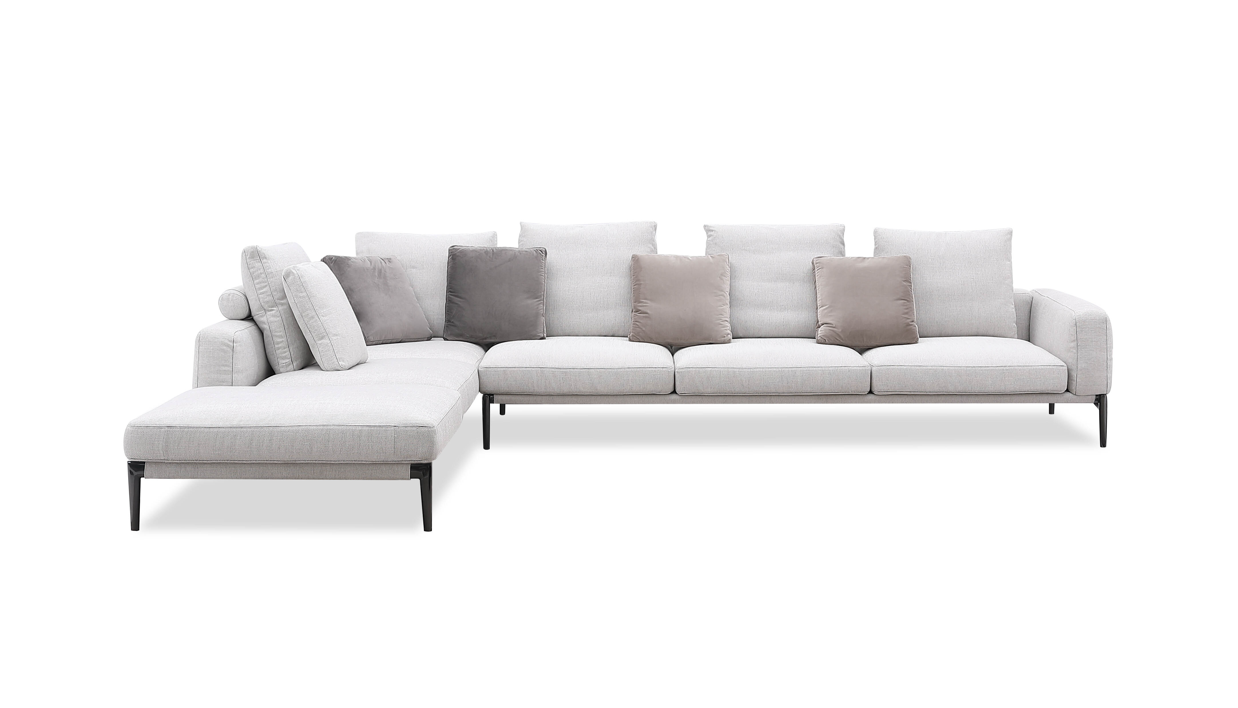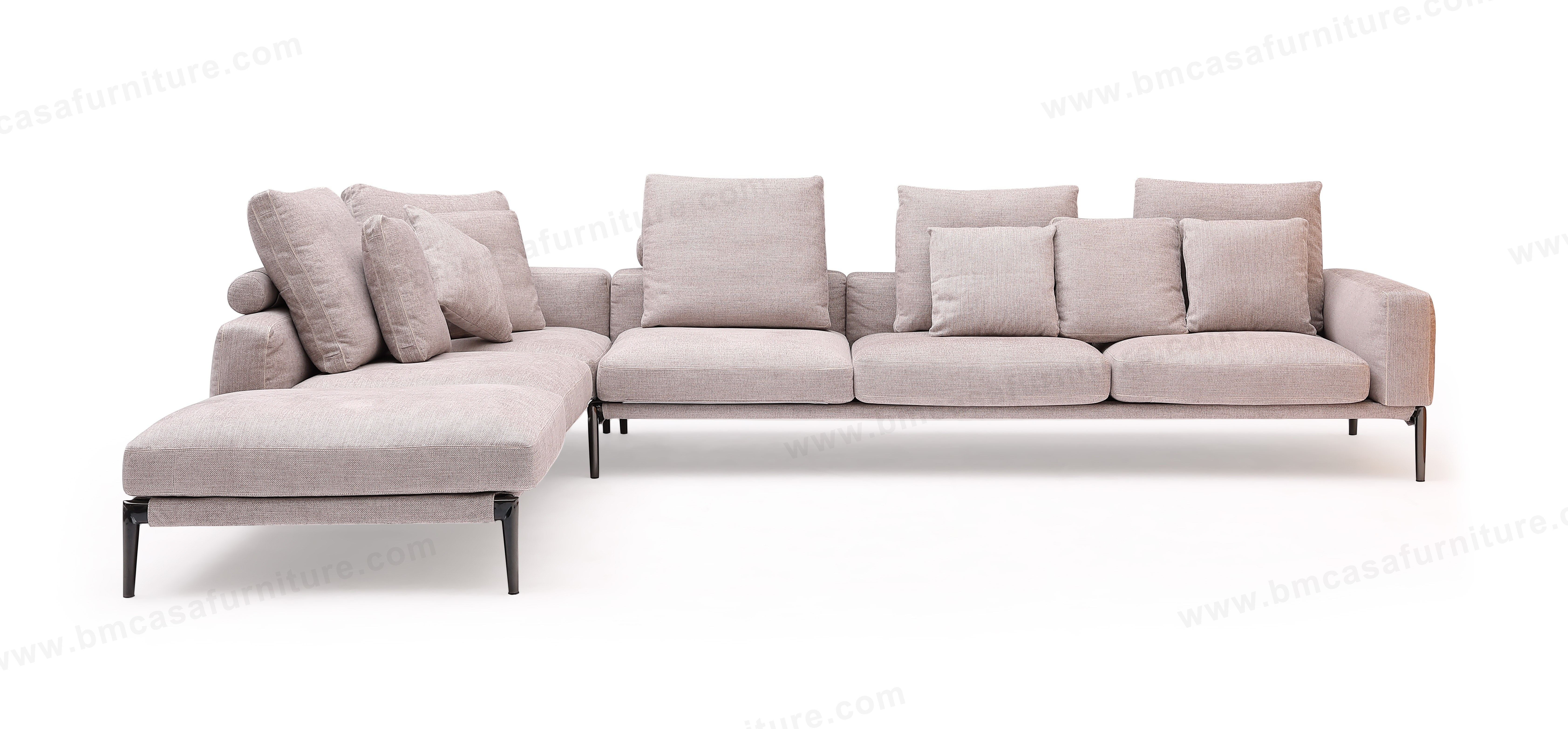 The F9556 includes multiple components such as left/right arm units, chaise, armless seating, and a footstool, allowing buyers to rearrange layouts to suit open-plan spaces, living rooms, or commercial lounges.