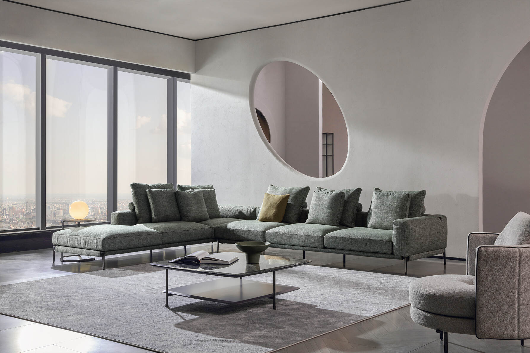 Combining breathable fabric with refined leather surfaces, the sofa offers a premium tactile experience. The materials are selected for both comfort and easy maintenance, ideal for high-traffic use.