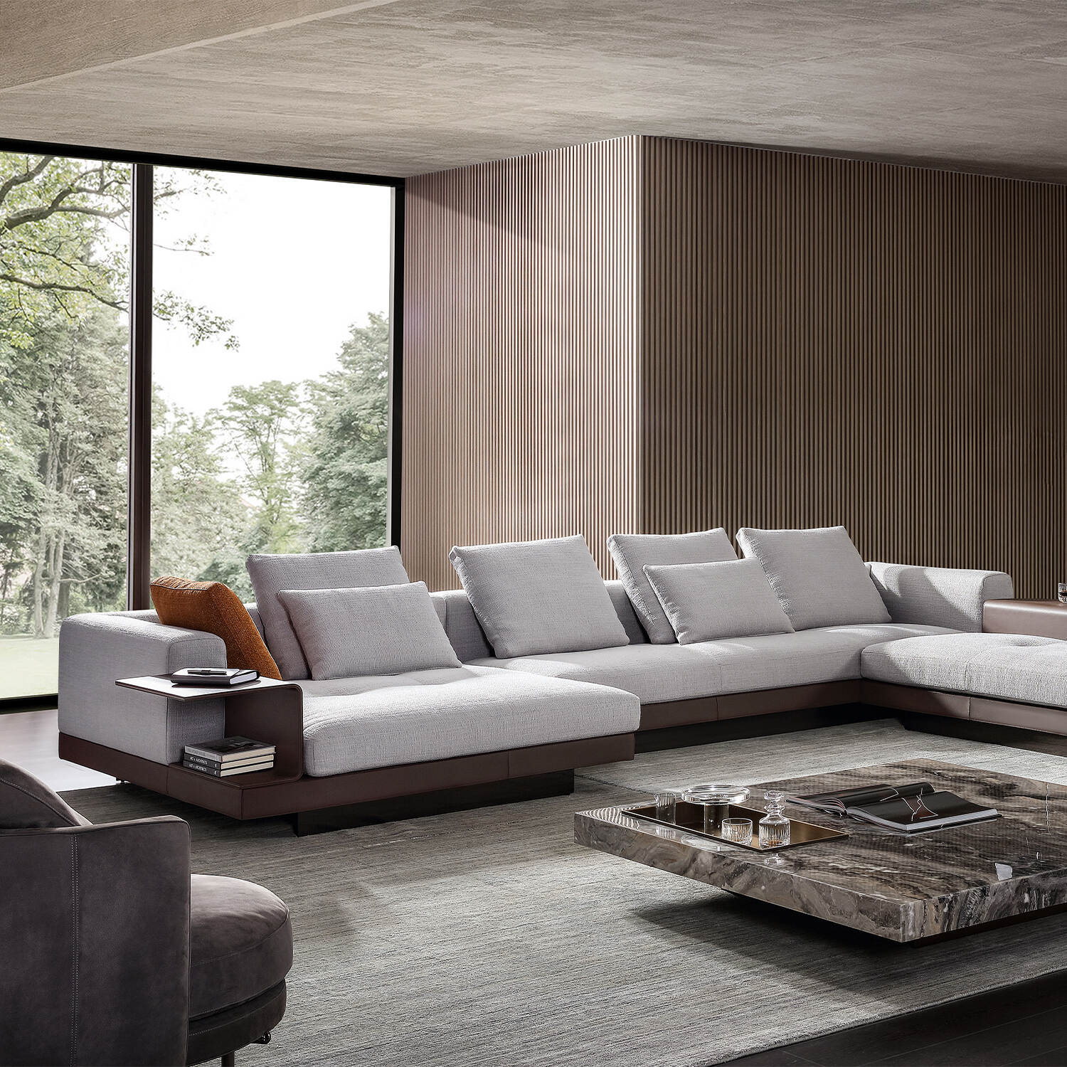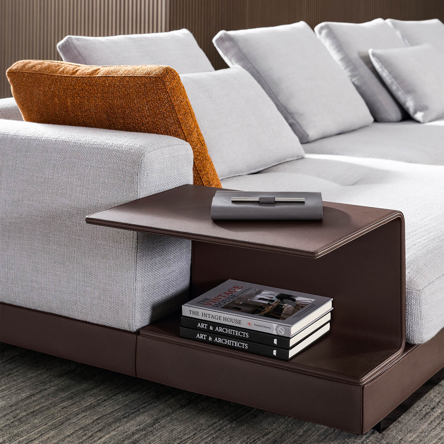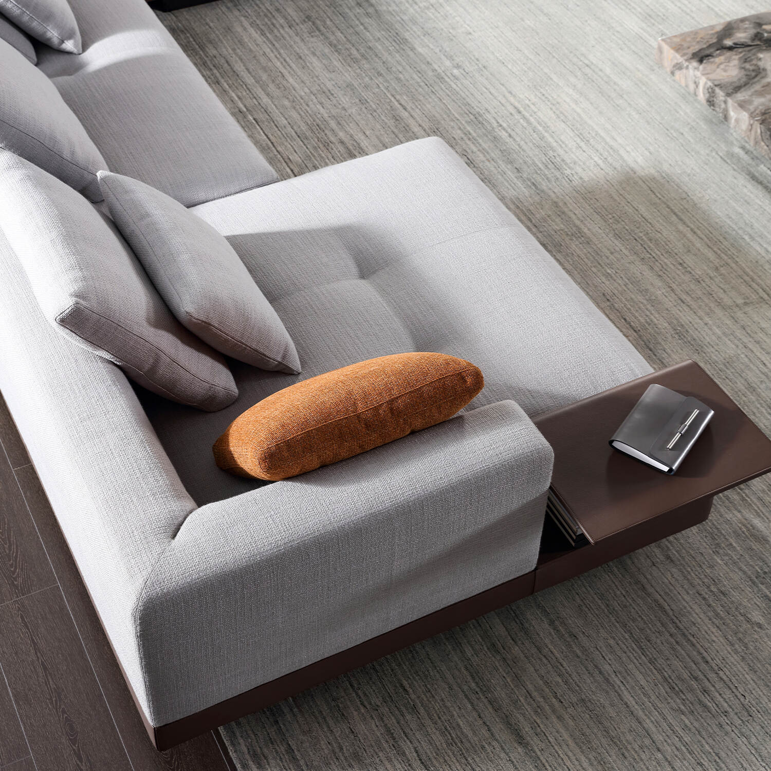 One armrest features an integrated storage box that helps organize essentials like remotes, magazines, or beverages. The top of the storage box doubles as a cup holder, keeping your space tidy and your favorite drink within easy reach.