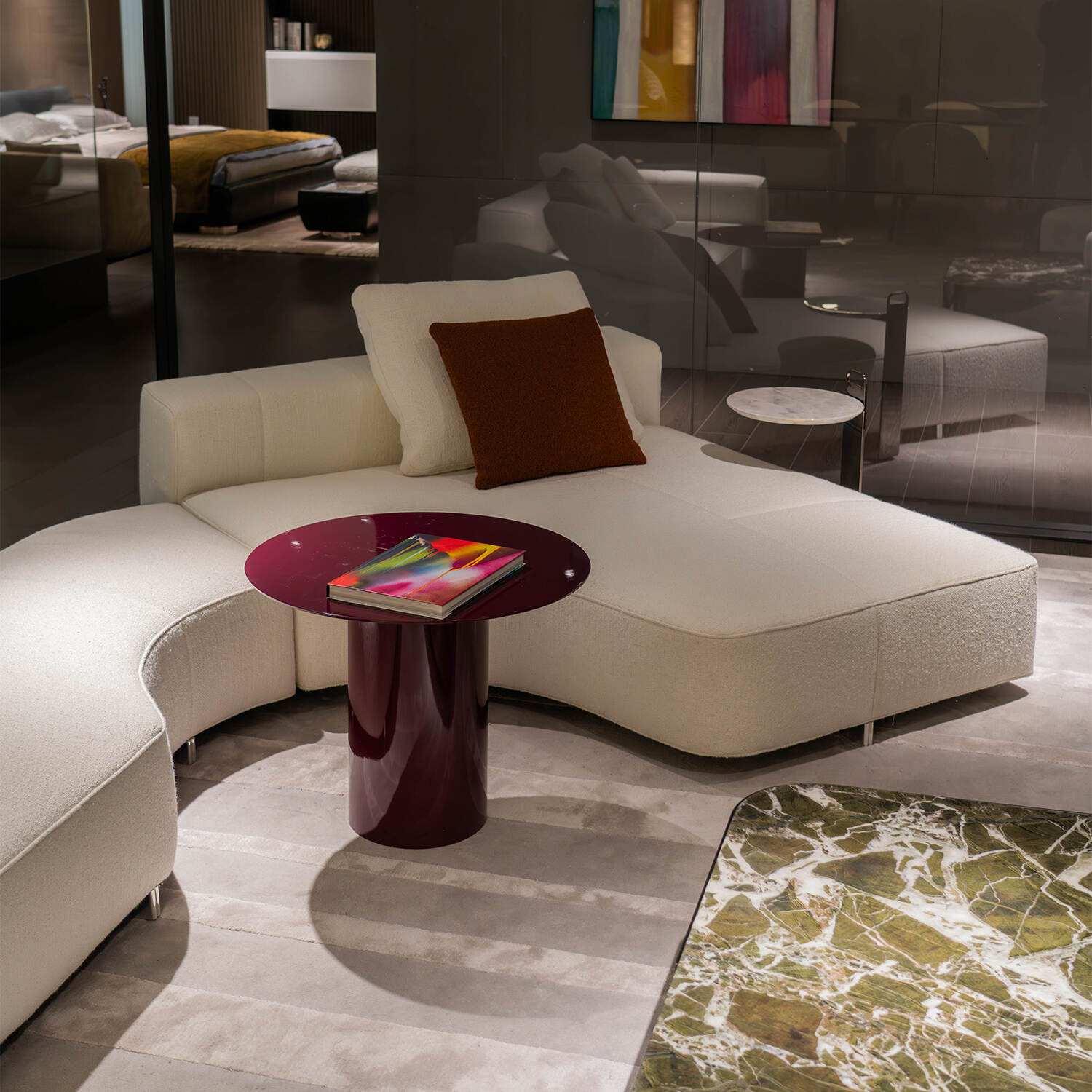 This sofa’s modular design allows users to adapt its configuration based on space and preference. A movable side table is integrated for easy placement of drinks or essentials without needing to get up.