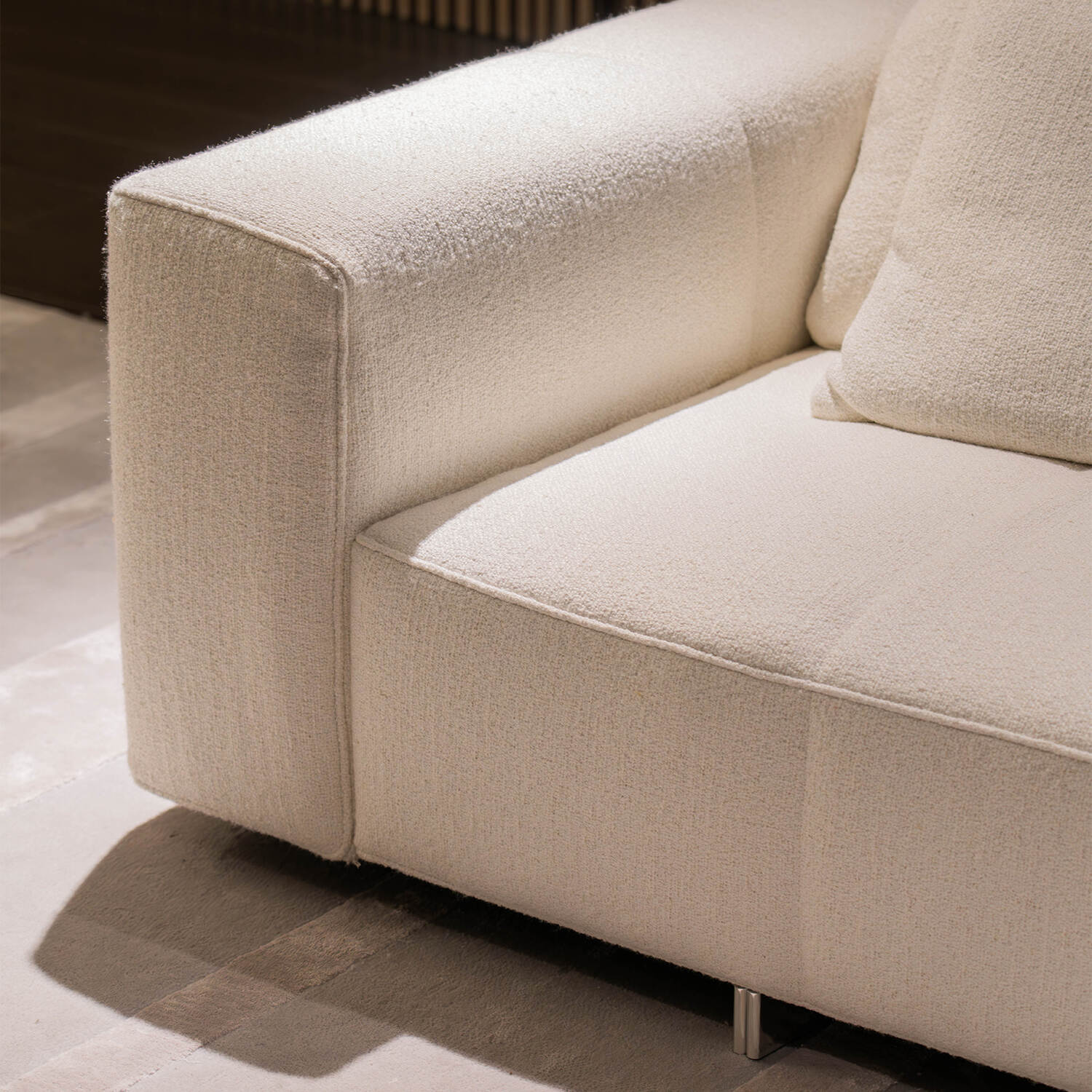 Covered in premium white fabric, the sofa introduces a calm and serene aesthetic into any space. The included dark-toned cushions create a chic contrast that enhances modern interior layers.