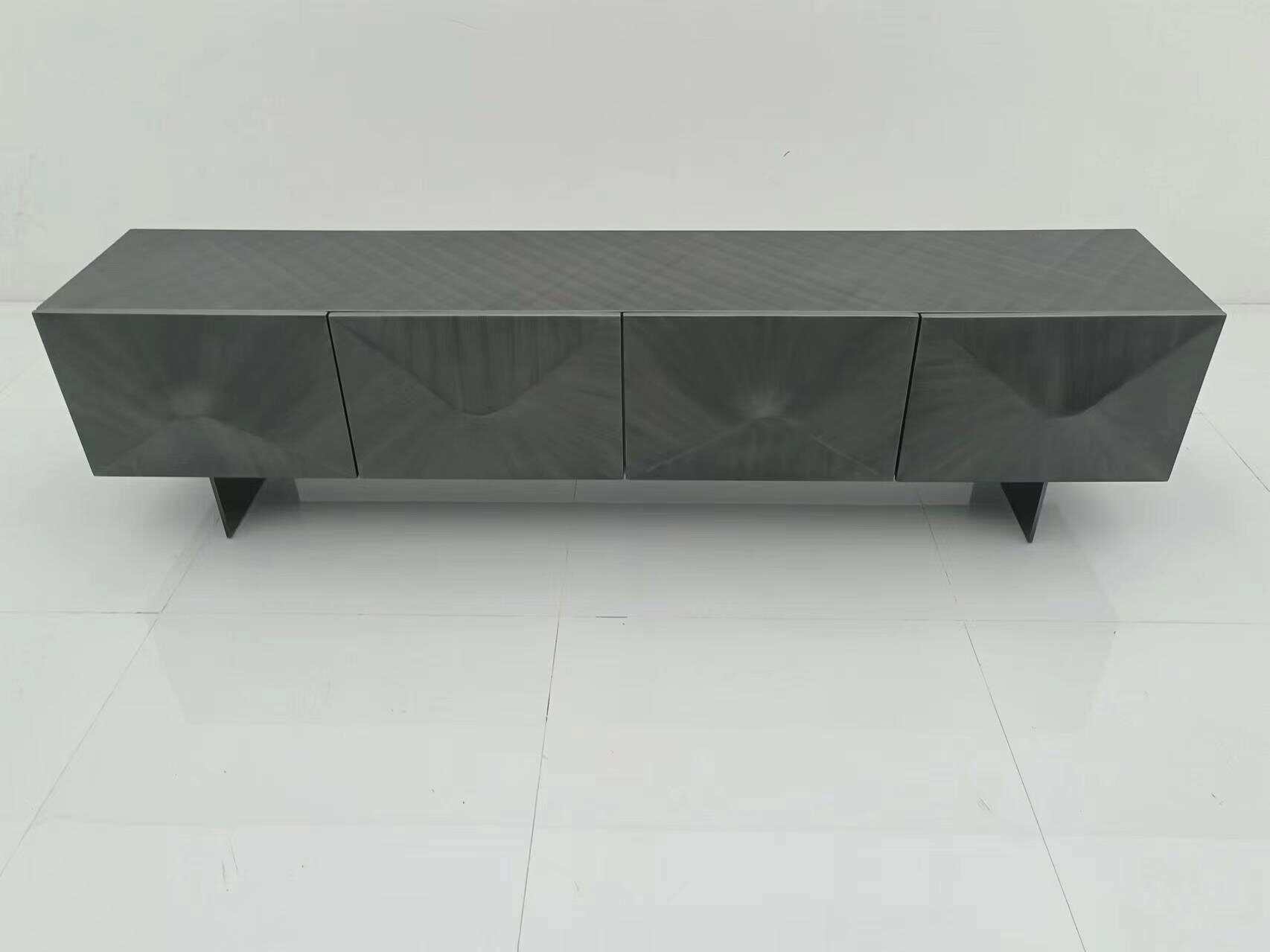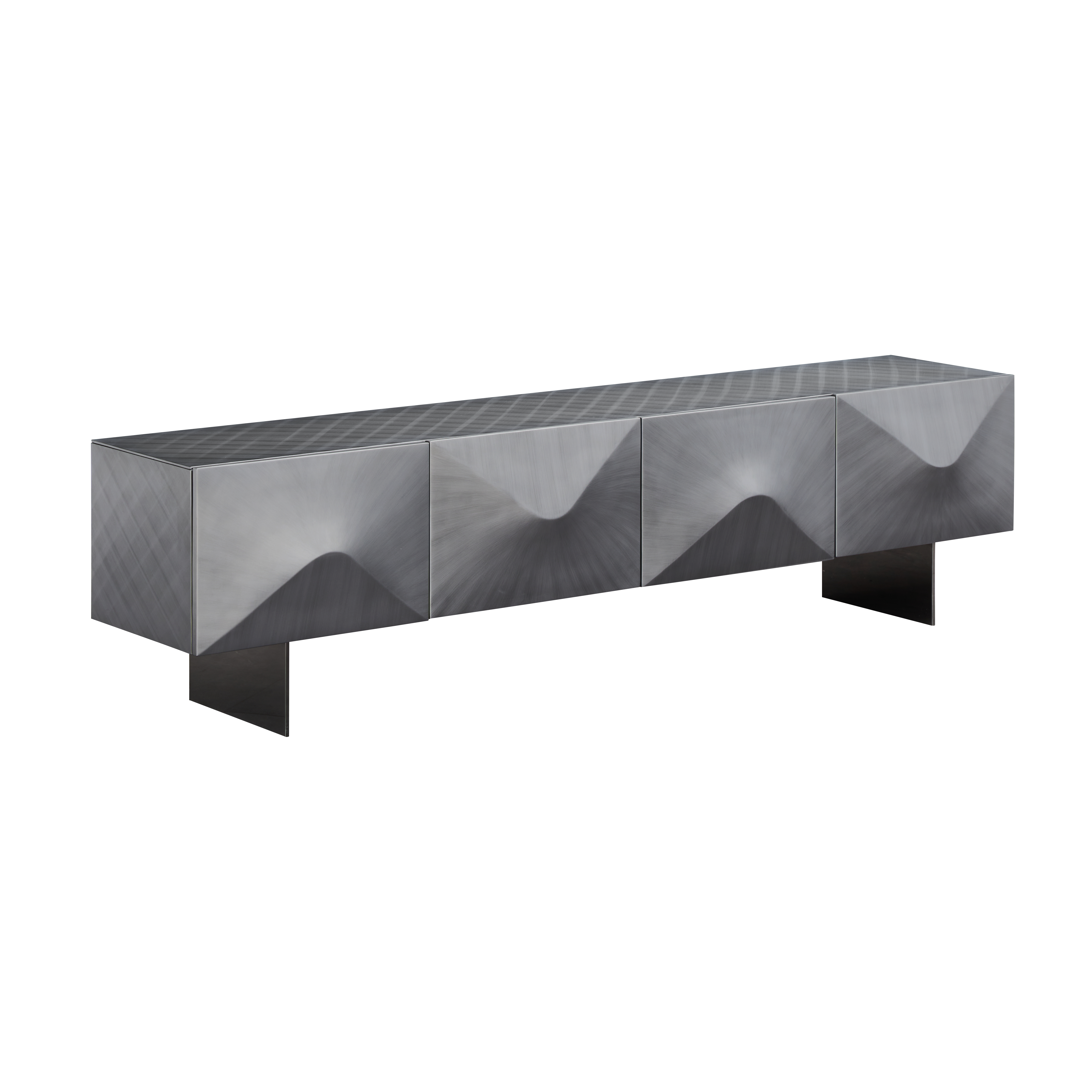 This contemporary TV stand is crafted from durable MDF and steel, featuring a distinctive hilly corrugated design and a sophisticated silver-grey finish. The unit includes four cabinet doors that offer generous storage for electronics, cables, or accessories, helping keep living spaces organized. Its reflective surface brightens the room, while the elegant form adds a touch of refinement to any setting.