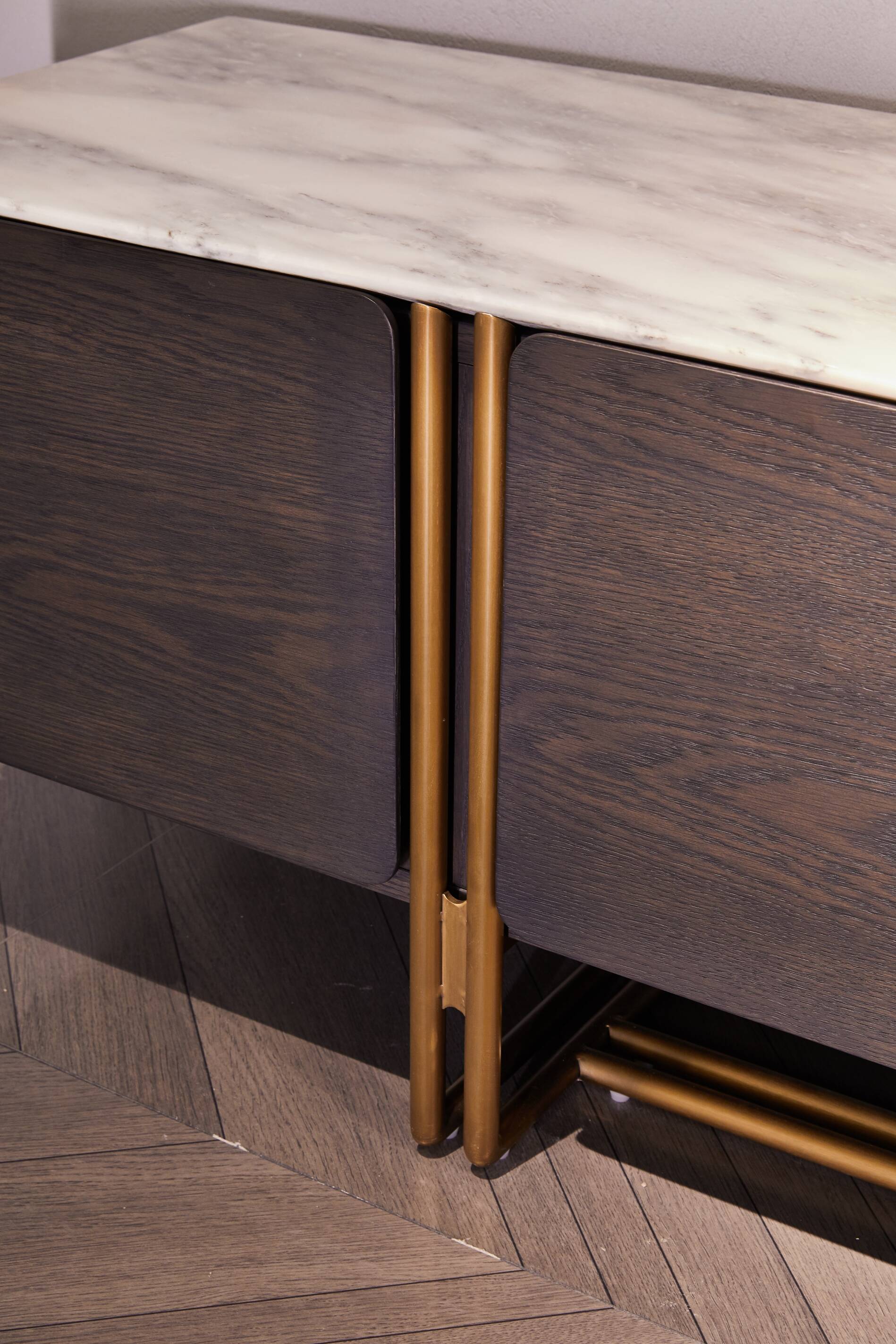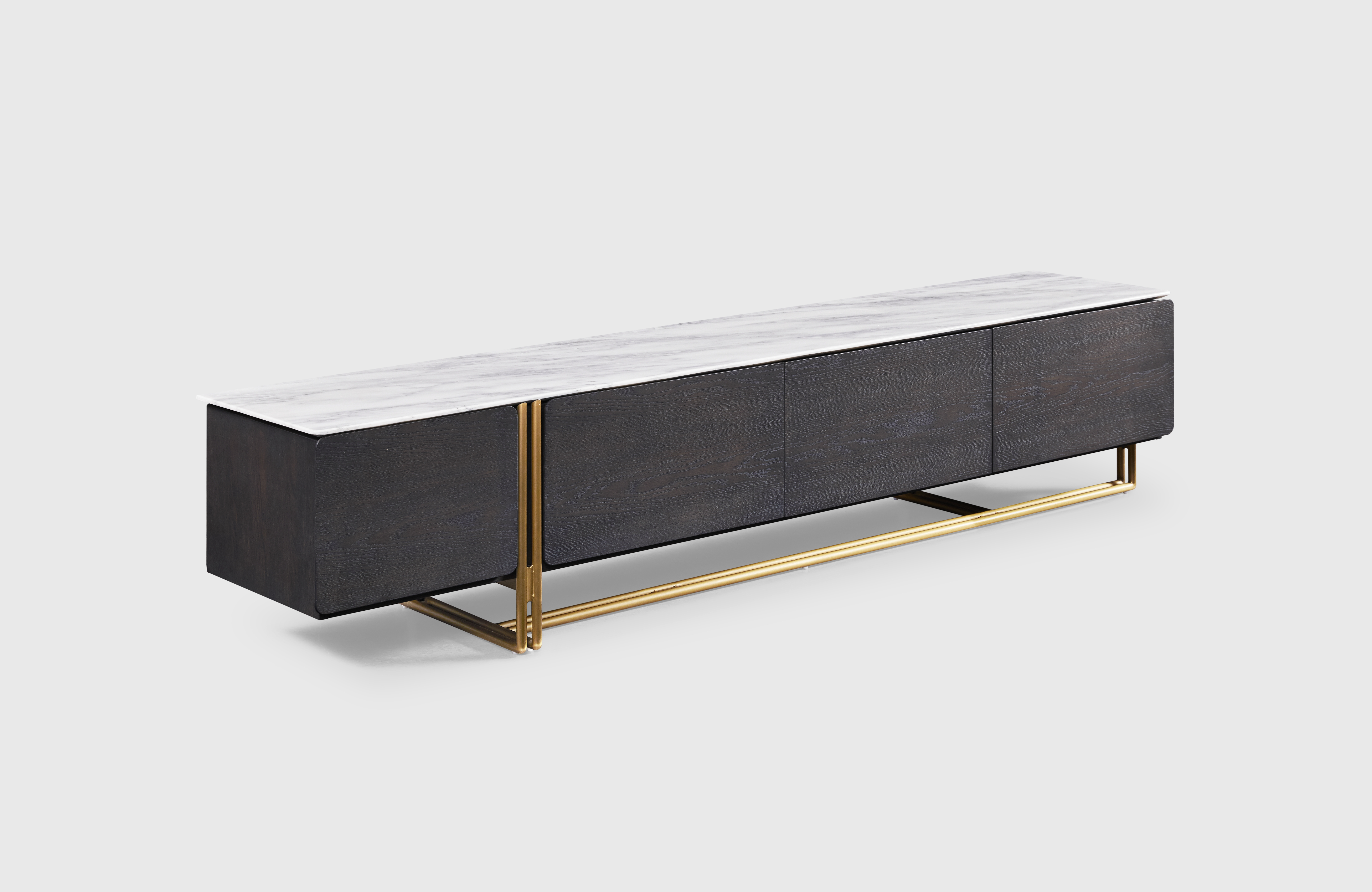The BRV21015-2 TV stand combines premium materials with modern craftsmanship to deliver a stylish and functional solution for contemporary interiors. With a marble top, oak veneer finish, and brass legs, this unit effortlessly blends durability with elegance. Designed to meet various home and hospitality furnishing needs, it supports customization to match diverse aesthetic preferences.